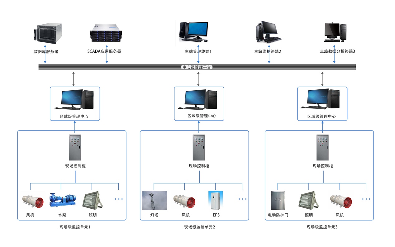 公共防災(zāi)救援設(shè)備監(jiān)控系統(tǒng)采用多層分級(jí)結(jié)構(gòu),自上而下劃分為中心級(jí)管理平臺(tái)、區(qū)域級(jí)管理中心和現(xiàn)場(chǎng)級(jí)監(jiān)控單元。其中現(xiàn)場(chǎng)級(jí)監(jiān)控單元包括水泵,風(fēng)機(jī),照明,電動(dòng)防護(hù)門,燈塔,EPS等現(xiàn)場(chǎng)設(shè)備以及負(fù)責(zé)現(xiàn)場(chǎng)設(shè)備監(jiān)控的現(xiàn)場(chǎng)控制柜。