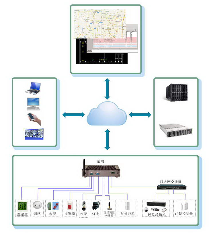 子系統(tǒng)主要包括:環(huán)境監(jiān)測(cè)系統(tǒng)、無(wú)線設(shè)備測(cè)溫系統(tǒng)、煙火監(jiān)測(cè)系統(tǒng)、門磁監(jiān)測(cè)系統(tǒng)、入侵監(jiān)測(cè)系統(tǒng)、水浸監(jiān)測(cè)系統(tǒng)、視頻監(jiān)控系統(tǒng)。
